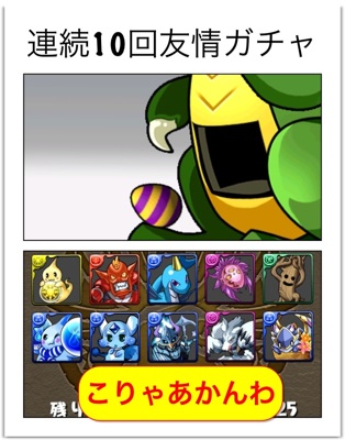 友情ガチャは単発で引くよりも10回連続で引くほうが金卵が出やすい印象があります。