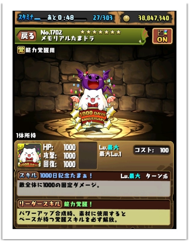 ログイン1000日目達成!たまドラくれた