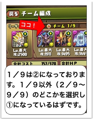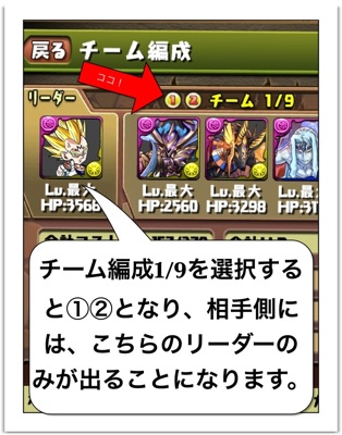 結論から言うと、チーム編成1/9以外を使用中の場合、その選択しているパーティーのリーダーが①になる。
